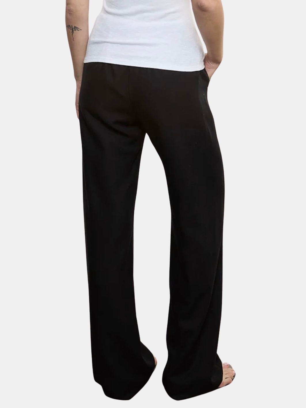 This pant is crafted from Tencel linen twill, which gives it a graceful drape and ensures comfort through breathability, making it a versatile choice for various occasions. Featuring a low to mid-rise and side pockets, the Twill Everywhere Pant is a perfect balance of style and function. Shown in Black.
