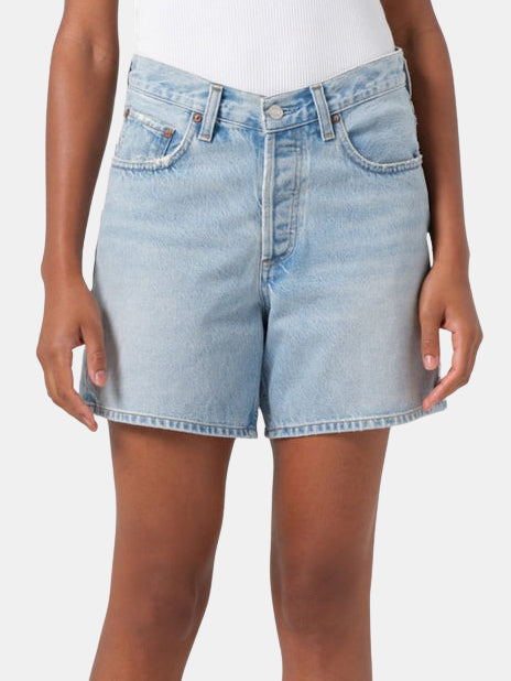 Dress these v-waist shorts up or down with ease. They feature a sharp, pitched v waist and a close-fitting top block that eases from thigh to leg. Finished with a clean hem for a sleek, polished look. With an innovative zero stretch blend of soft regenerative and recycled cotton, plus subtle fading and whiskering, they're a must-have for your go-to wardrobe. Shown in Backbeat.